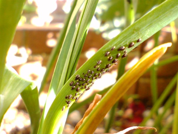 にんにくの葉に何やら小さな虫がびっしり着いています。早速、駆除しておきましょう!