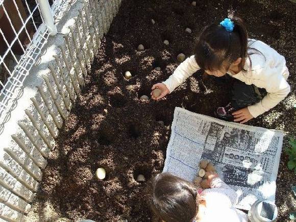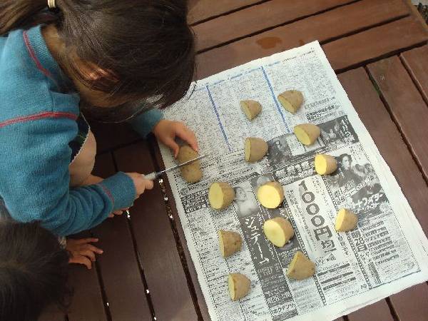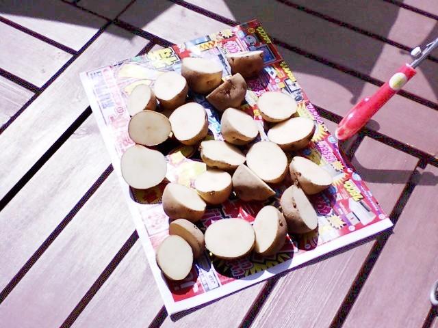 今年もジャガイモを作ります♪去年は小さかったので、今年は大きいのができるかなっ 〜手を切らないようにね!