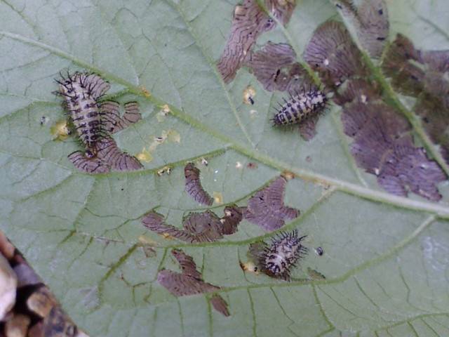 見つけました!テントウムシダマシの幼虫がいっぱいひっついています!こりゃ大変!