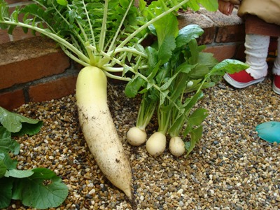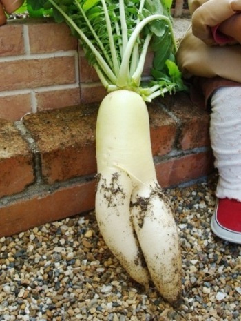 手前がミニ大根で、奥がいつもの大根です。わかりますか!?