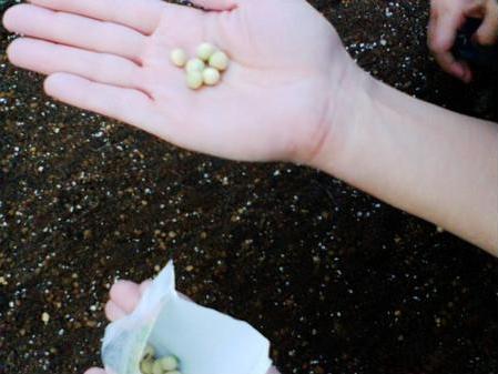 枝豆の種(大豆)です。3〜4粒を等間隔に植えていきます。